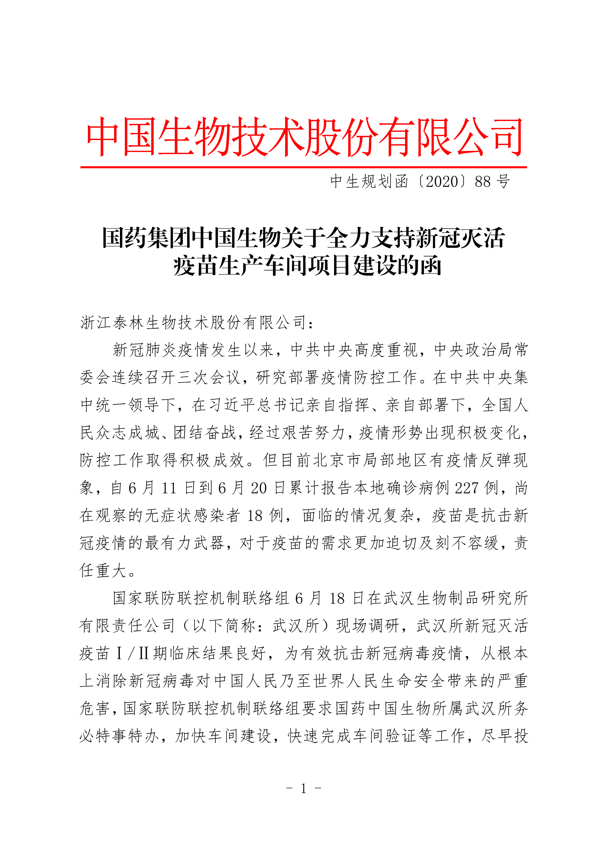 The vaccine is the most powerful weapon against the COVID-19 epidemic, and the need of vaccine for epidemic prevention is urgent. Wuhan Institute of Chinese Institute of Biological Products (owned by SINOPHARM) has started the construction of laboratory and  workshop  mainly for the development and production of the COVID-19 vaccine. To control the epidemic,the workshop should be built and put into use as soon as possible.