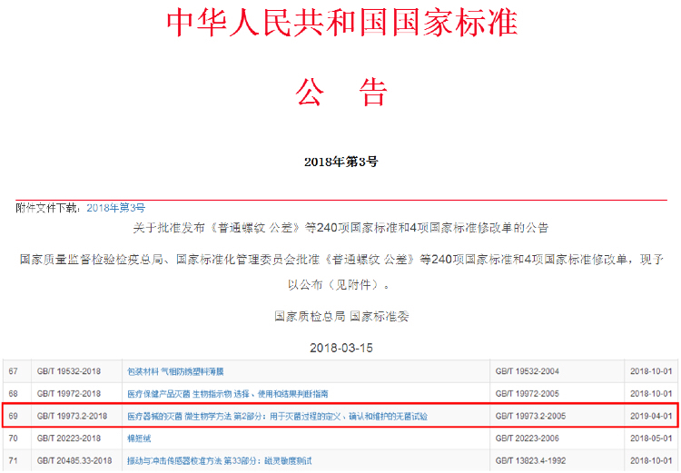 3月15日,国家质量监督检验检疫总局、国家标准化管理委员会发布2018年第3号中国国家标准公告,对新一批国家标准予以公布,其中包括了由金沙9001以诚为本为第一起草单位的国家标准《医疗器械的灭菌 微生物学方法 第2部分:用于灭菌过程的定义、确认和维护的无菌试验》。